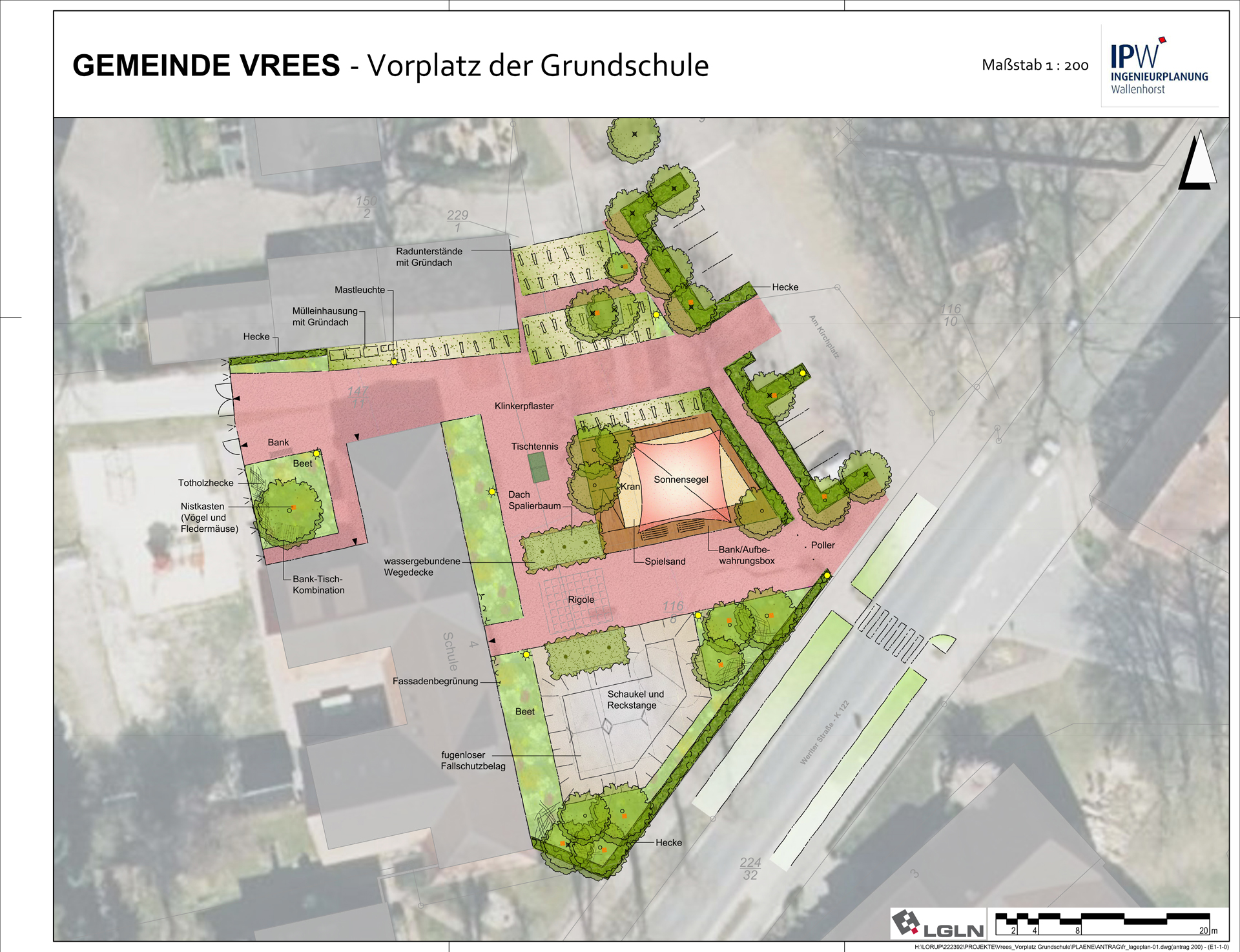 Im Zuge der Umgestaltung des Vorplatzes der Grundschule entstehen barrierefreie Spielmöglichkeiten sowie Fahrradabstellmöglichkeiten unter begrünten Dächern. Bei der Planung wird besonderer Wert auf eine klimafreundliche Gestaltung gelegt.
