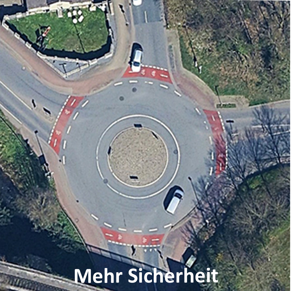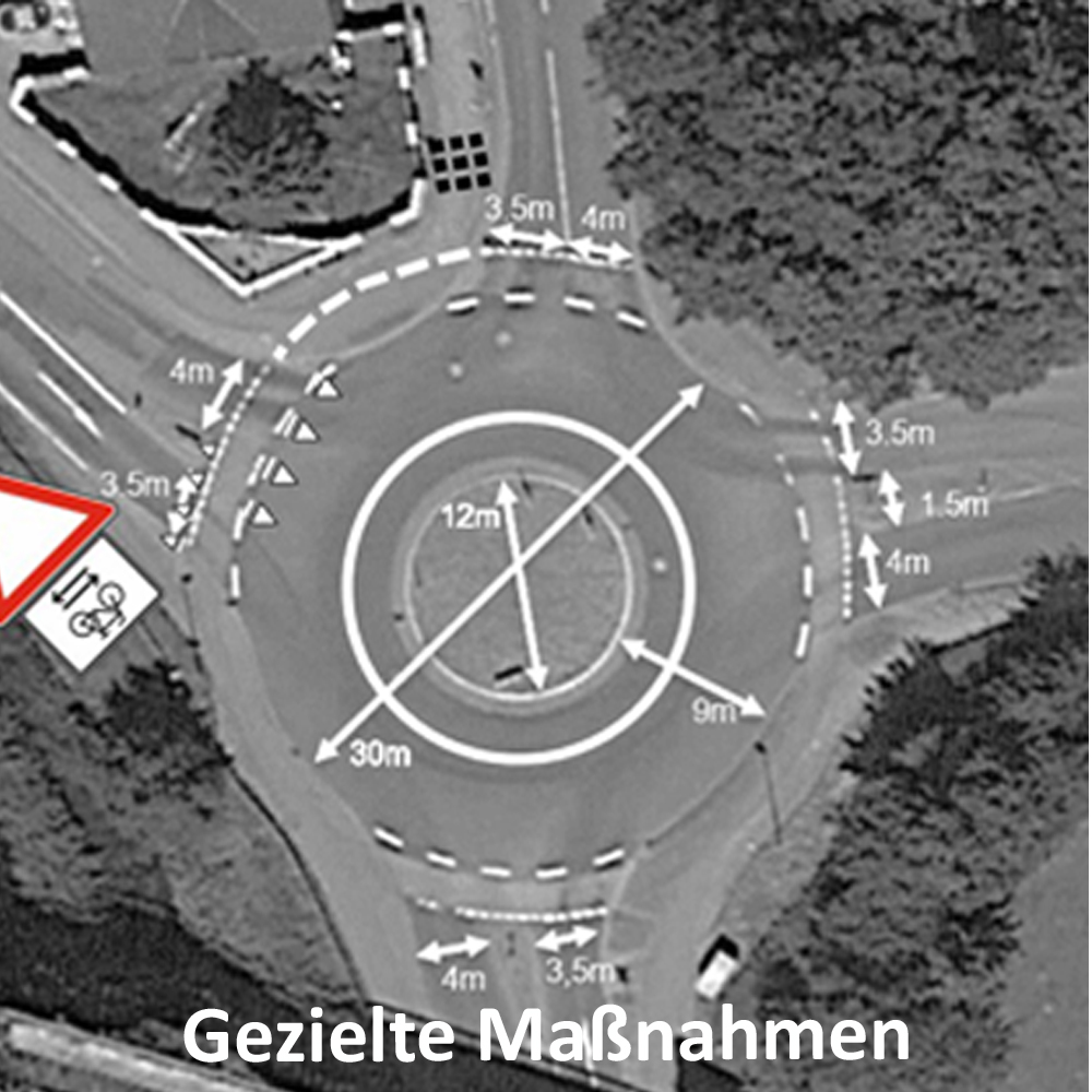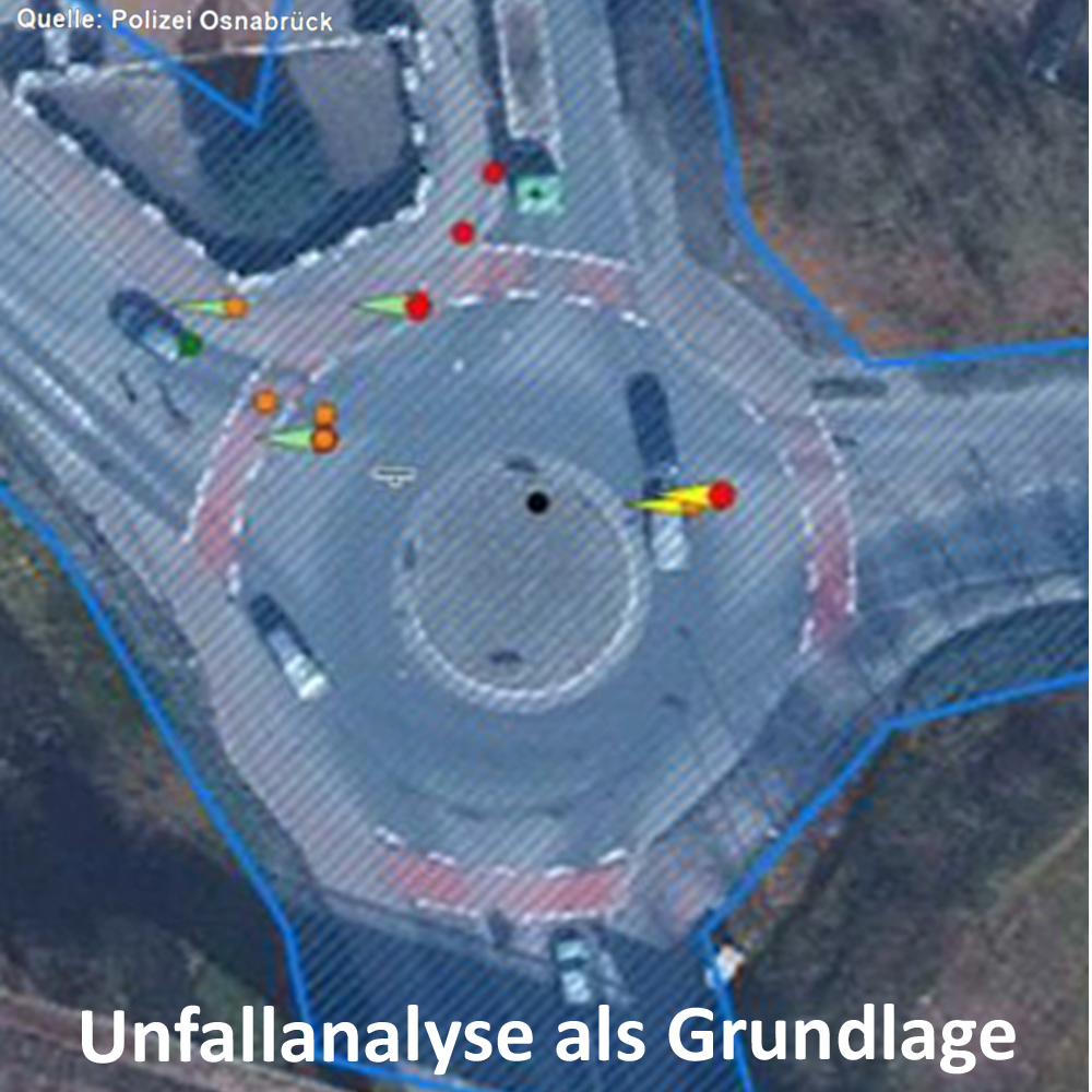 Unser Ansatz ist dabei die Optimierung der Verkehrsinfrastruktur, um so bestehende oder künftig mögliche Gefahrenquellen zu erkennen und zu entschärfen. Dabei müssen nicht unbedingt kostspielige und langwierige Umbauarbeiten als Ergebnis stehen. Oft sind auch relativ günstige und schnell umzusetzende Lösungen sehr effektiv. So wie z.B. am Kreisverkehr Malberger Straße / Harderberger Weg in Georgsmarienhütte, den wir im Auftrag des Landkreises Osnabrück unter die Lupe genommen haben. Hier wurden wirksame Entschärfungen durch einfache Markierungen wie z.B. einen Innenring zur Verengung der Fahrbahn oder „Haifischzähnen“ zur Sicherung der Radfahrerfurten erzielt.